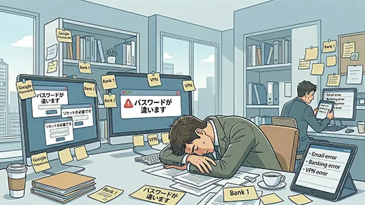 増え続けるパスワード管理に社員が疲れ、管理者もパスワードリセットや端末設定の対応が煩雑で面倒になっている。複数のツールを使い分けることで操作の手間が増え、会社全体の生産性を落としてしまっている。