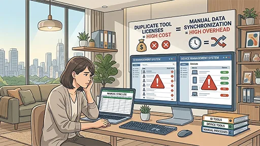 IDとデバイスを別々のツールで管理したり、Excelで手動管理しているため、無駄な工数が発生している。さらに、複数の管理ツールを契約していることでライセンスコストが膨らんでいる。